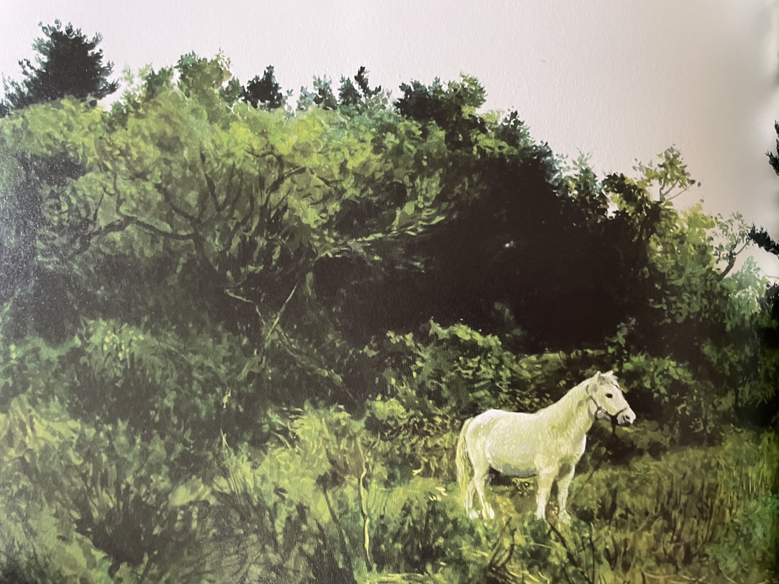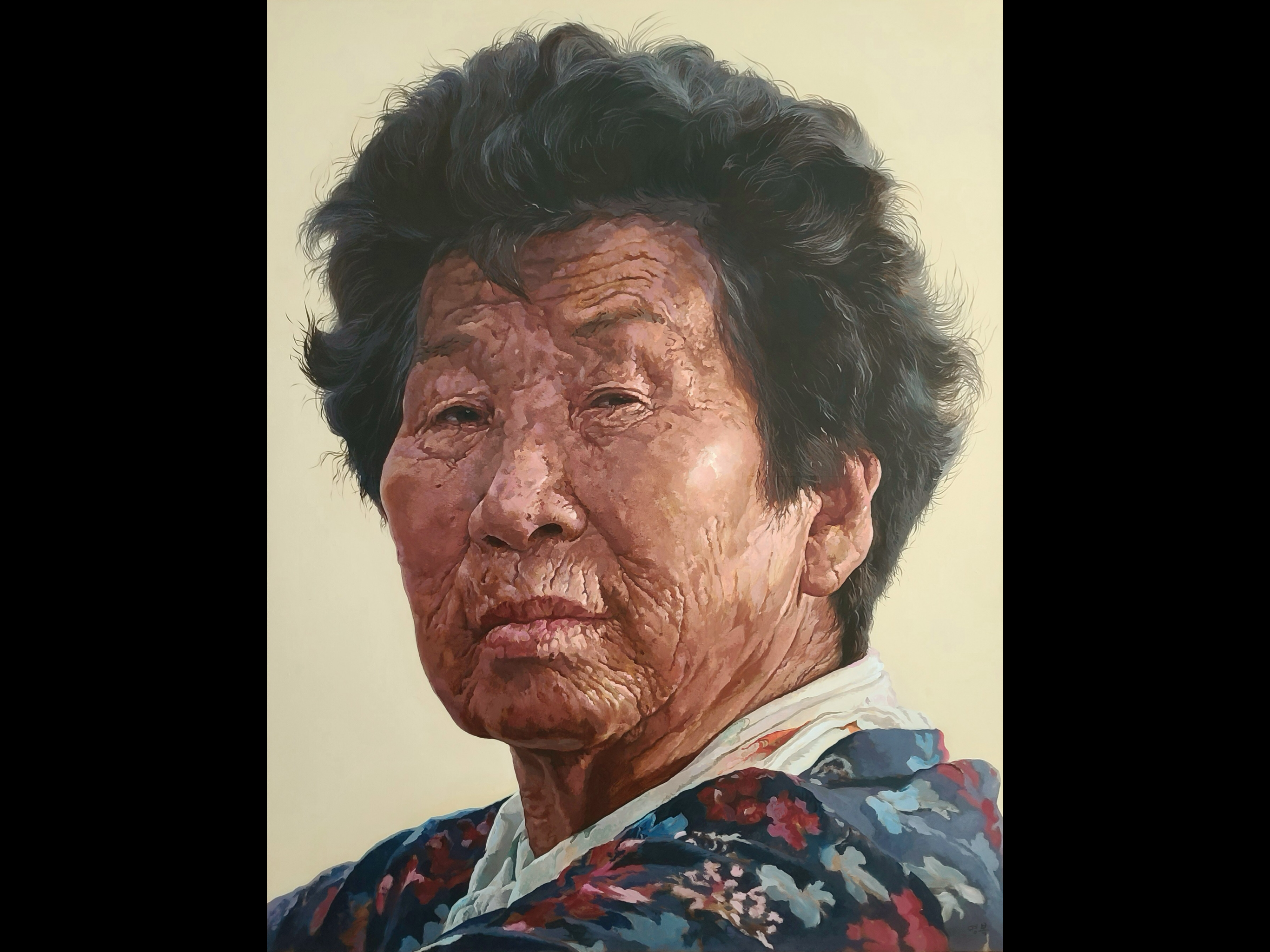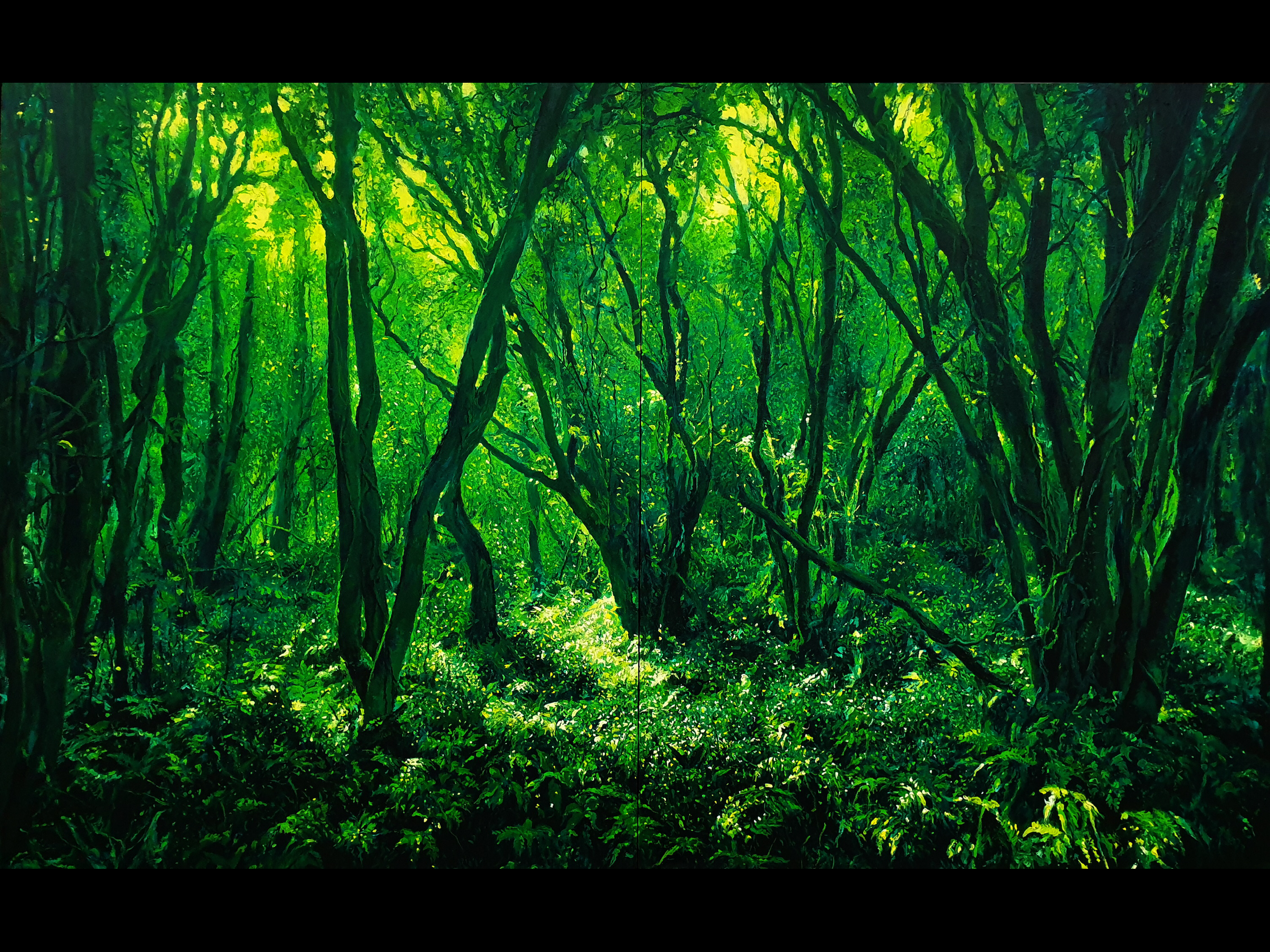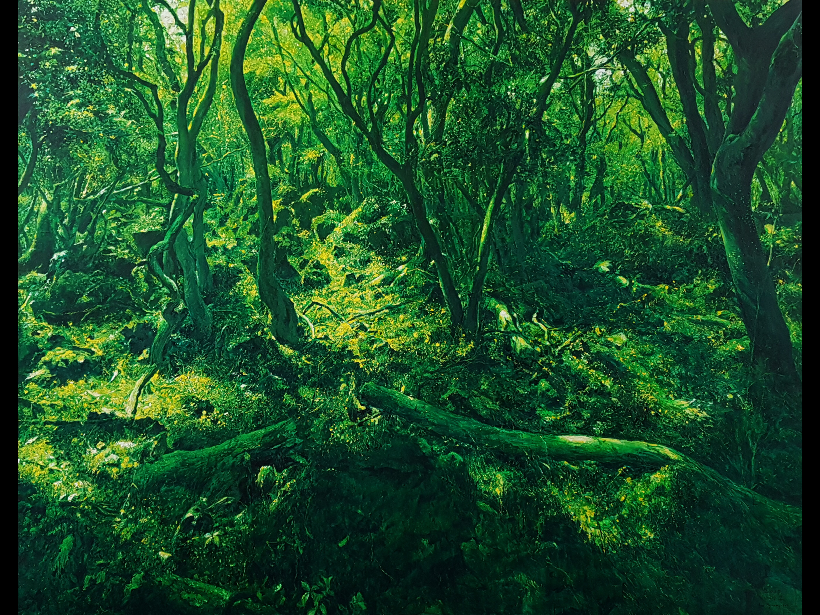 Many of his paintings are done on a grand scale, including truly impressive portraits of women he interviewed about their experiences during the tragic events of the late 1940s and early 1950s known collectively as “4.3” – Sasam. Mr. Lee has a deep sensitivity to the horrors of war, and many of his paintings depict its victims and perpetrators in a highly realistic yet imaginative style that forces the viewer to think deeply about the role of individuals in causing mass suffering. His large-scale, striking paintings of forest scenes were inspired by his reflection upon the trauma experienced by the people of Jeju during 4.3.