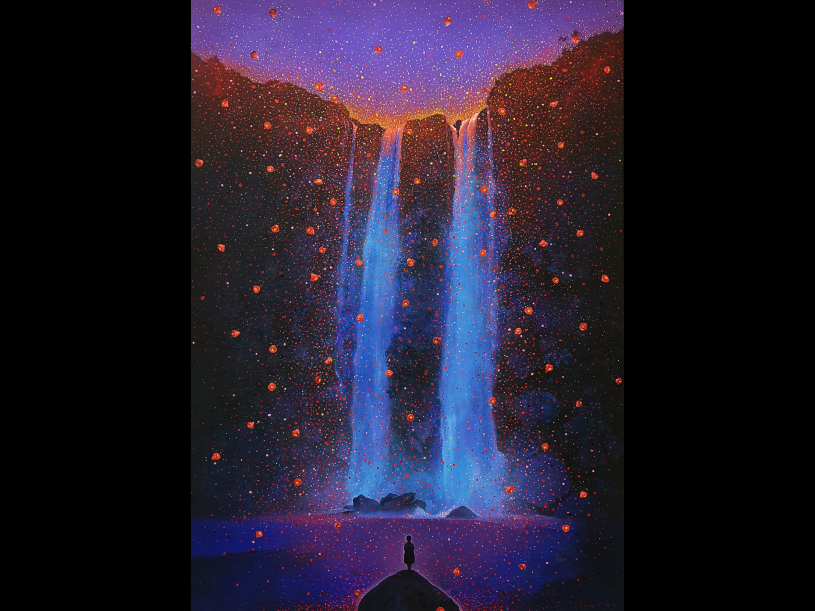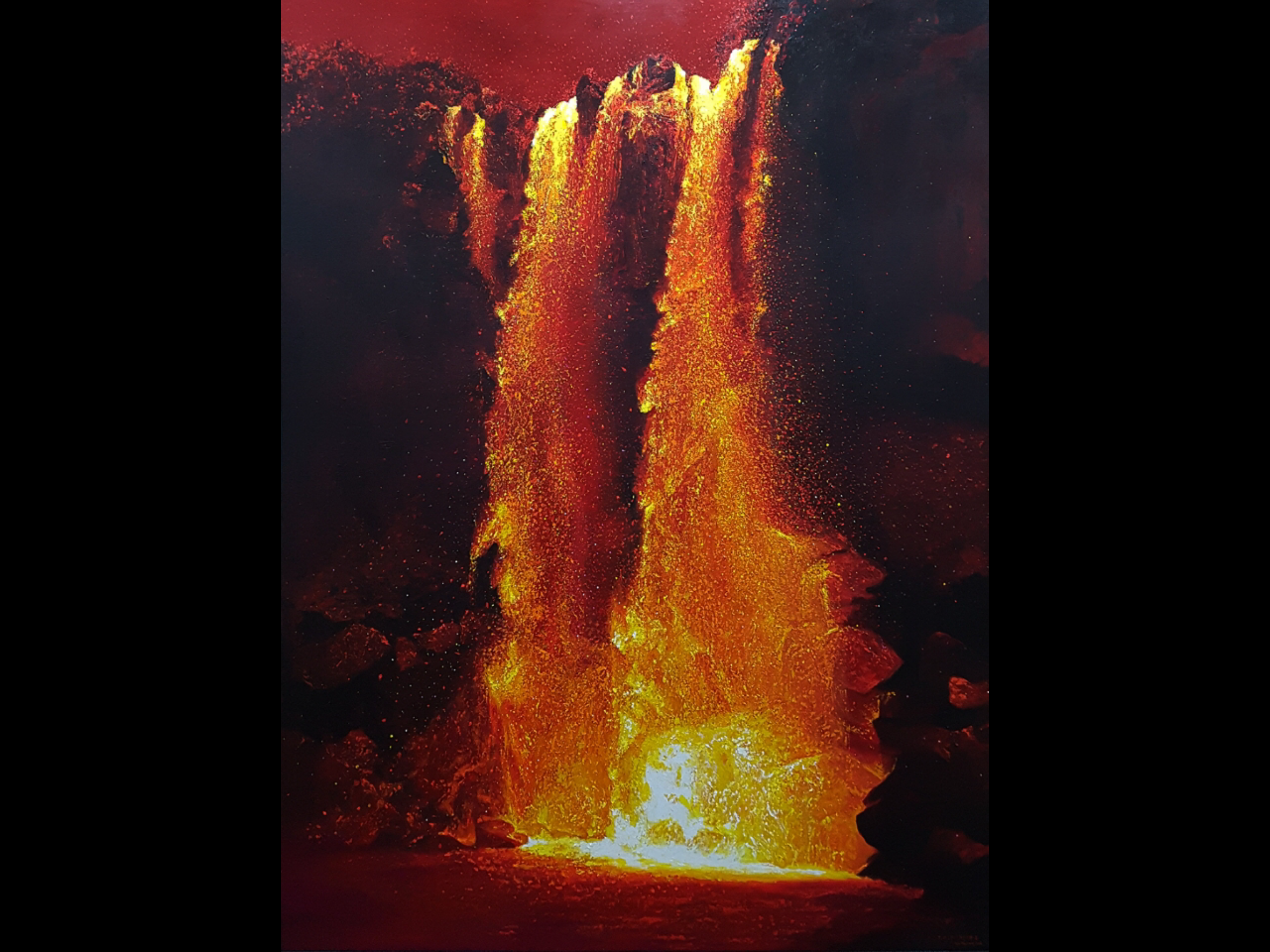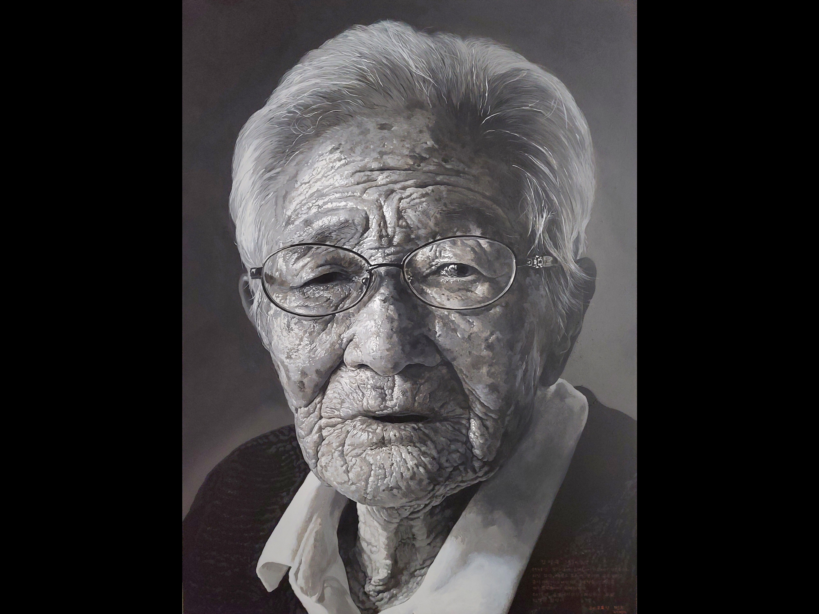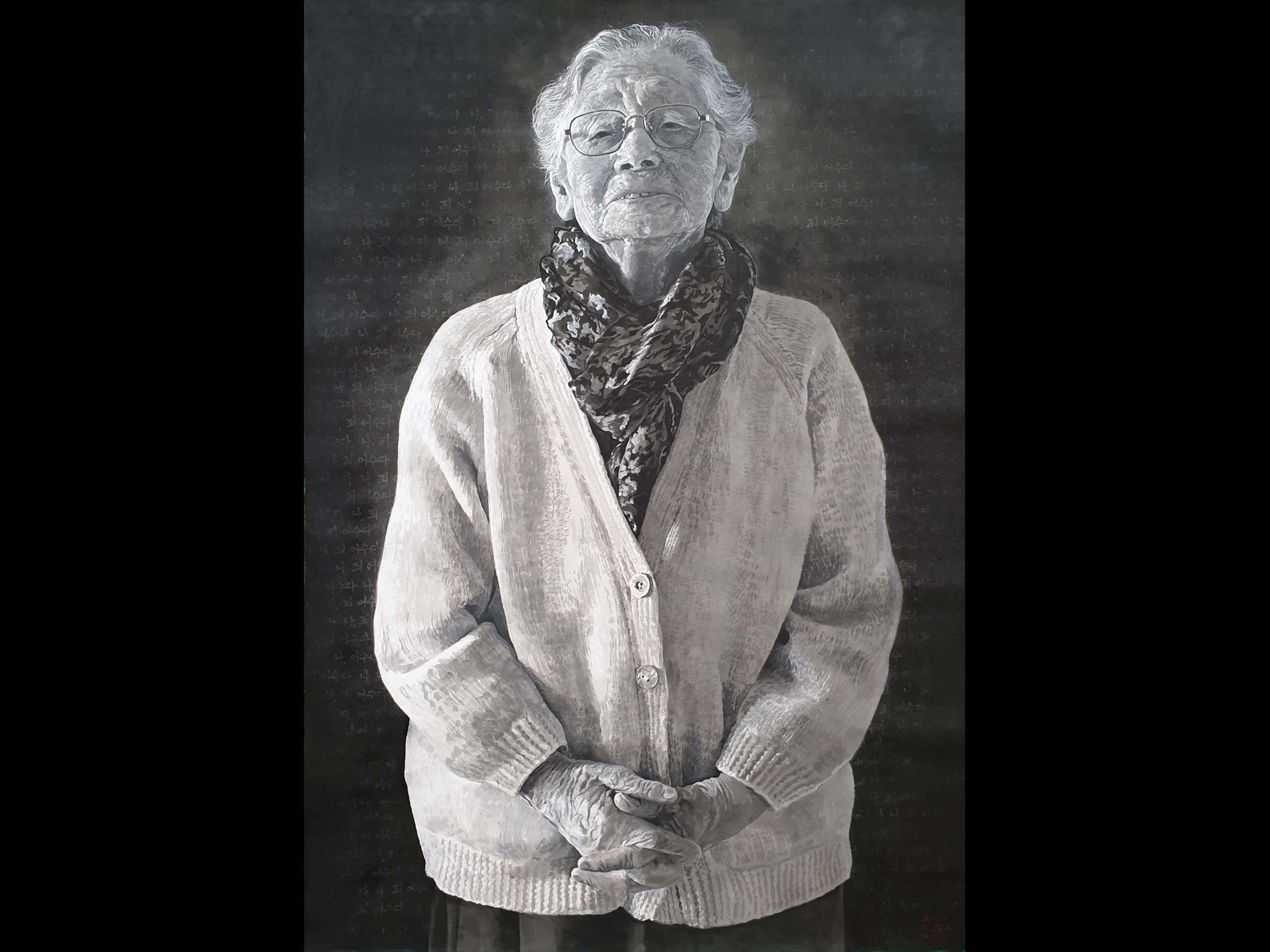 Many of his paintings are done on a grand scale, including truly impressive portraits of women he interviewed about their experiences during the tragic events of the late 1940s and early 1950s known collectively as “4.3” – Sasam. Mr. Lee has a deep sensitivity to the horrors of war, and many of his paintings depict its victims and perpetrators in a highly realistic yet imaginative style that forces the viewer to think deeply about the role of individuals in causing mass suffering. His large-scale, striking paintings of forest scenes were inspired by his reflection upon the trauma experienced by the people of Jeju during 4.3.